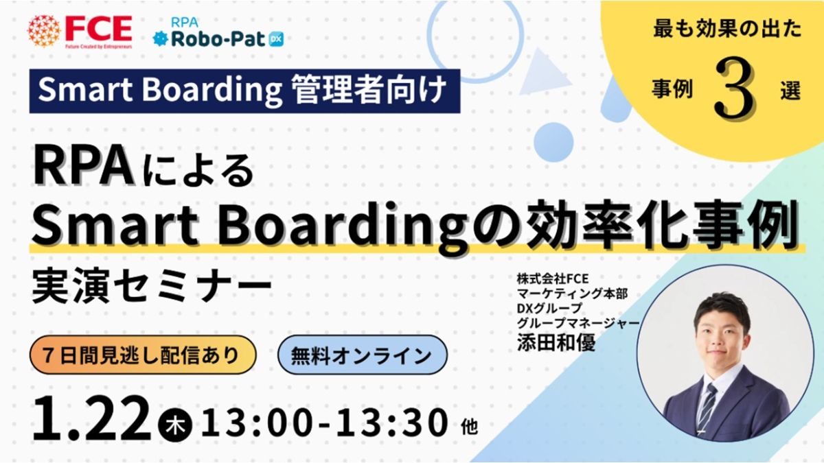 株式会社FCE(本社:東京都新宿区、代表取締役社長:石川淳悦、証券コード:9564)は、最新セミナー『RPAによるSmart Boardingの効率化事例 実演セミナー』を開催いたします。