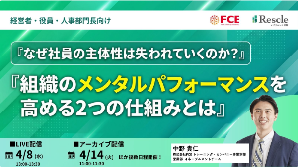 株式会社FCE(本社:東京都新宿区、代表取締役社長:石川淳悦、証券コード:9564)は、最新セミナー『なぜ社員の主体性は失われていくのか? 組織のメンタルパフォーマンスを高める2つの仕組みとは』を開催いたします。